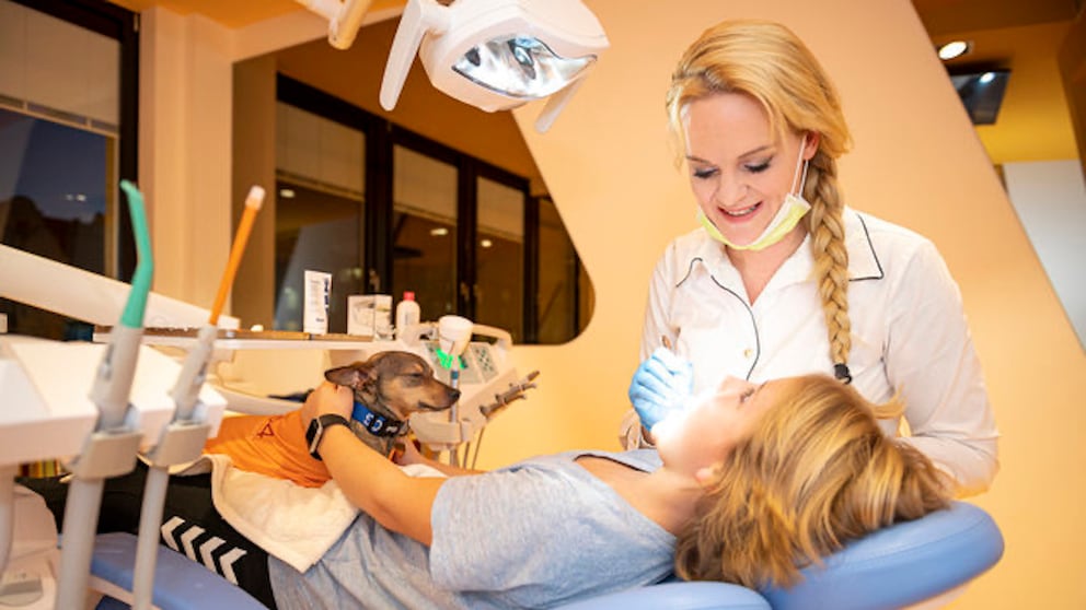 „Ja. Aber wenn die Kinder große Angst haben, unterstützt der Hund dabei, erst einmal den Raum zu zeigen. Dann hüpft er eventuell auf den Zahnarztstuhl und wir fahren damit hoch und runter. Der Hund kann aber auch Zähne zeigen und helfen zu veranschaulichen, wie alles beim Zahnarzt funktioniert. Oder er kuschelt sich an den Patienten und die Kinder streicheln ihn. Der Hund reagiert auch, wenn die Kinder sehr angespannt sind. Interessanterweise fangen sie dann an zu schnüffeln und die Hände der Kinder zu lecken. Man merkt, wie der Hund von sich aus beschwichtigt. In solchen Fällen lasse ich sie selbstständig arbeiten, ohne ihnen zu sagen, was sie machen sollen. Das machen sie intuitiv echt gut.“